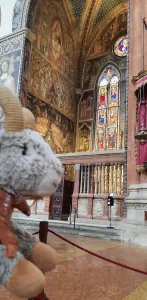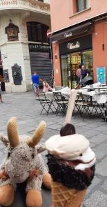[FR] Nous sommes en été et il fait très chaud, jusqu’à 29 degrés. Heuresement, il y a dans Bologne des glaciers excellents. Les glaces à la crème fondent en bouche. Rocoli le chevreau se régale ici avec une bonne glace au chocolat et à la crème i talienne qu’on appelle “fior di latte”.