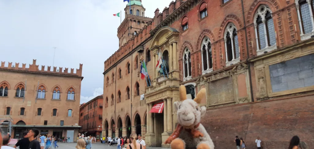 [CAT] Al cabrit li agrada molt viatjar més enllà dels seus pirineus. Però ara se n’ha anat molt lluny. Es troba ara a Itàlia a Bolonya. I és que aquesta ciutat italiana és molt desconeguda dels turistes pirinencs. Bolonya pot diur’se la Vila Taronja perque les fatxades dels edificis son d’aquest color. Aquestes ultimes fan contrast amb el color vermell de les rajoles dels seus palaus i esglésies.