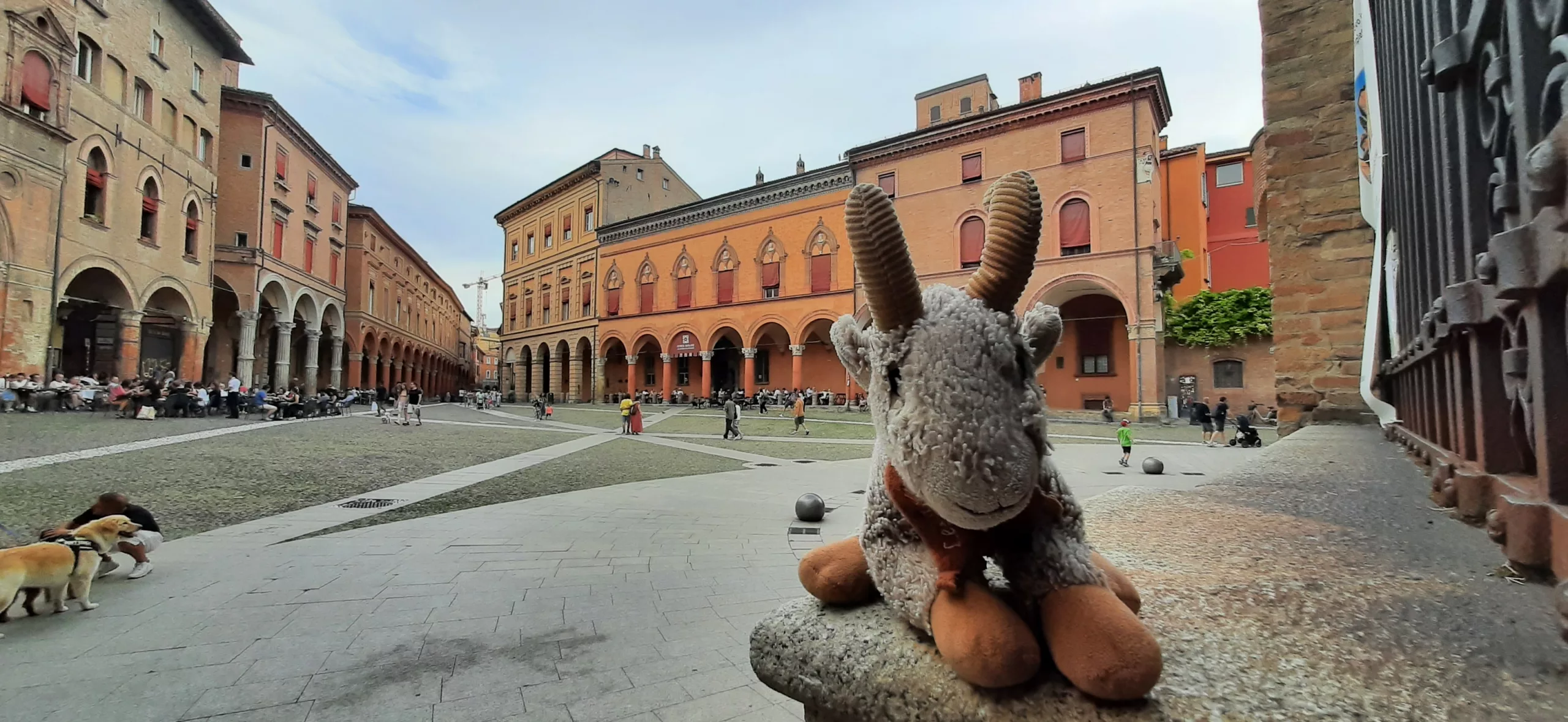 [FR] Le chevreau aime beaucoup voyager au-delà de ses Pyrénées. Mais cette fois-ci, il s’en est allé très loin. Il se trouve en ce moment en Italie, à Bologne. Le fait est que cette ville italienne reste méconnue des touristes venante de part et d’autre des Pyrénées. On pourrait l’appeller la Cité Orange car les façades des immeubles sont de cette couleur. Ces dernières for contraste avec le vermeil des briques de ses églises et palais.
